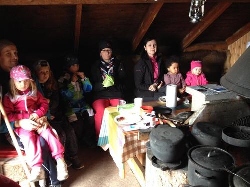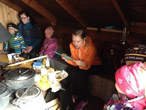 Mukana oli 20 hlöä, joista nuorin oli 12 kk ja vanhin 10 v. Aluksi kokoonnuimme majan eteen Nuuskamuikkusen tarinan ääreen ja esittelimme Nipsun retkikeittiön sekä Tuutikin ensiapupisteen.