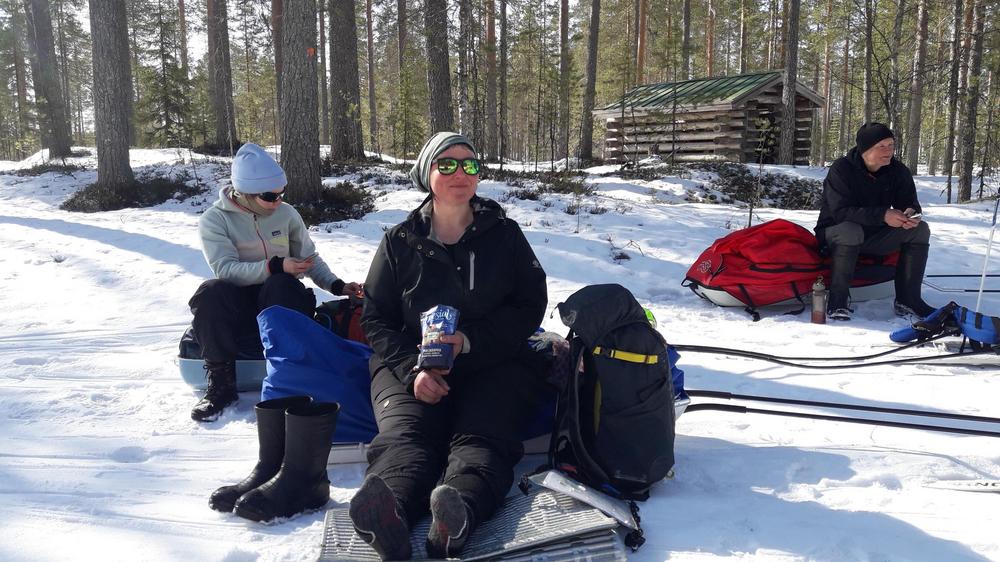 Lounaspaikan jälkeen helpotti , koska hiihtelimme upeassa auringonpaisteessa lampia pitkin Pitkäjärven kämpälle. Päätimme jäädä Pitkäjärvelle toiseksikin yöksi kun katsoimme seuraavien päivien säätiedotuksen ja Ruunaalla oli huono lumitilanne loppumatkaa ajatellen.