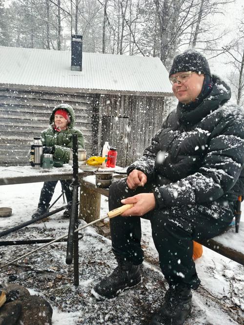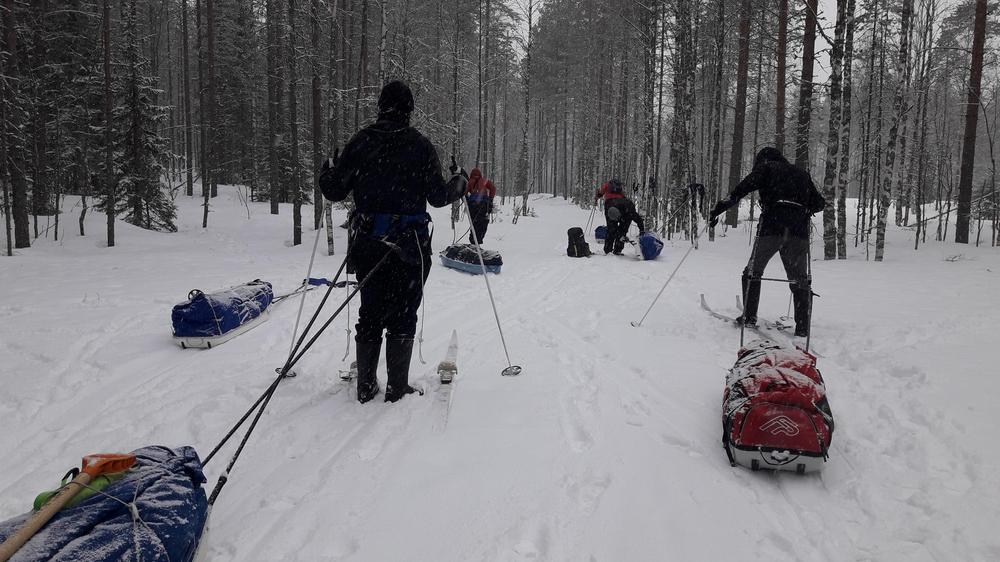 Keliosohteet heti aamusta alkaen haasteelliset, aamuyöstä asti satoi lunta, kannoimme välilla suksia, koska hiihtämisestä ei tullut mitään. Onneksi Särkkäjoen tien pohja oli kova. Meillä meni kolme ja puolituntia 7km matkaan.