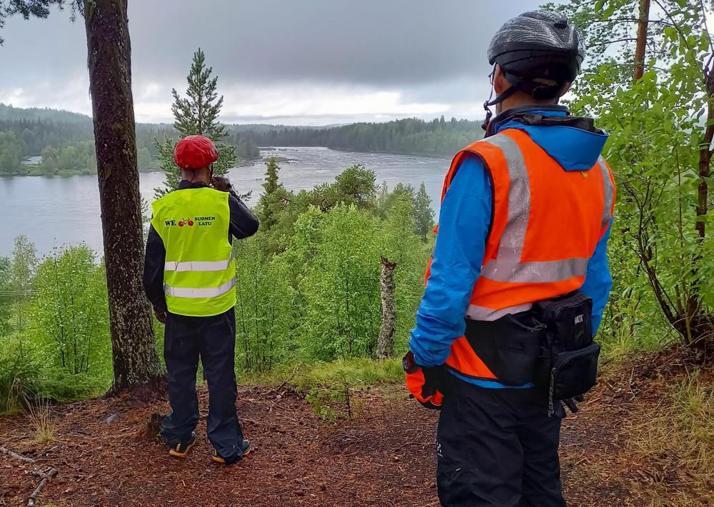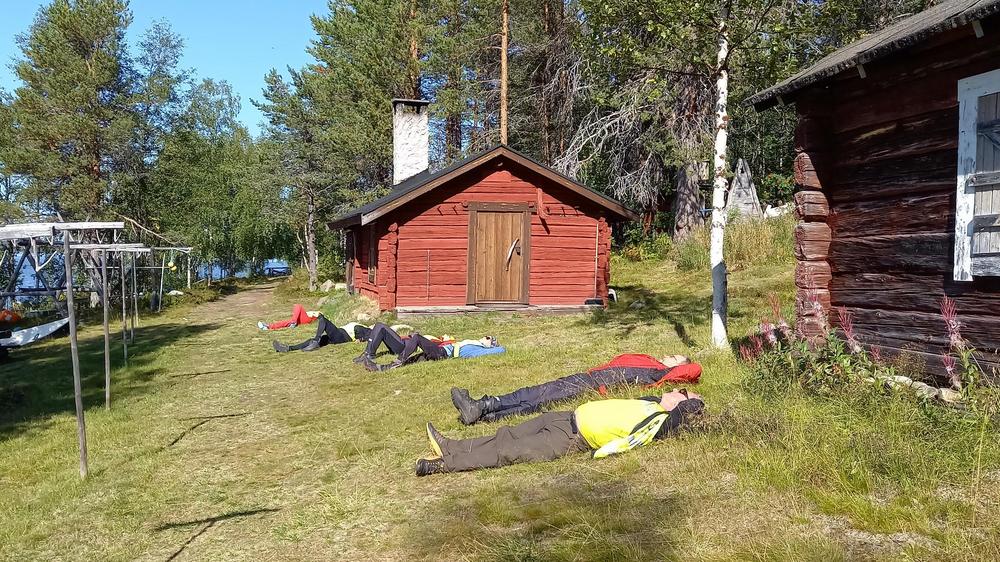 Viimeisenä päivänä pyöräilimme kahdessa into-/kuntoryhmässä. Eilisestä vajaaksi jääneestä pyöräilypäivästä suivaantuneet pyöräilijät polkaisivat satasen lenkin kiertämällä Jerisjärven uudestaan. Me muut pääsimme autokyydillä Kolariin, josta ajoimme rajajokea seuraillen Lappean kylään. Pysähdyimme ihmettelemään paikkaa, jossa Muonionjoki ja Tornionjoki yhtyvät ja katselimme hieman kaihoisasti Ruotsin suuntaan; sielläkin olisi käyty, jos korona ei olisi rajoittanut suunnitelmia.