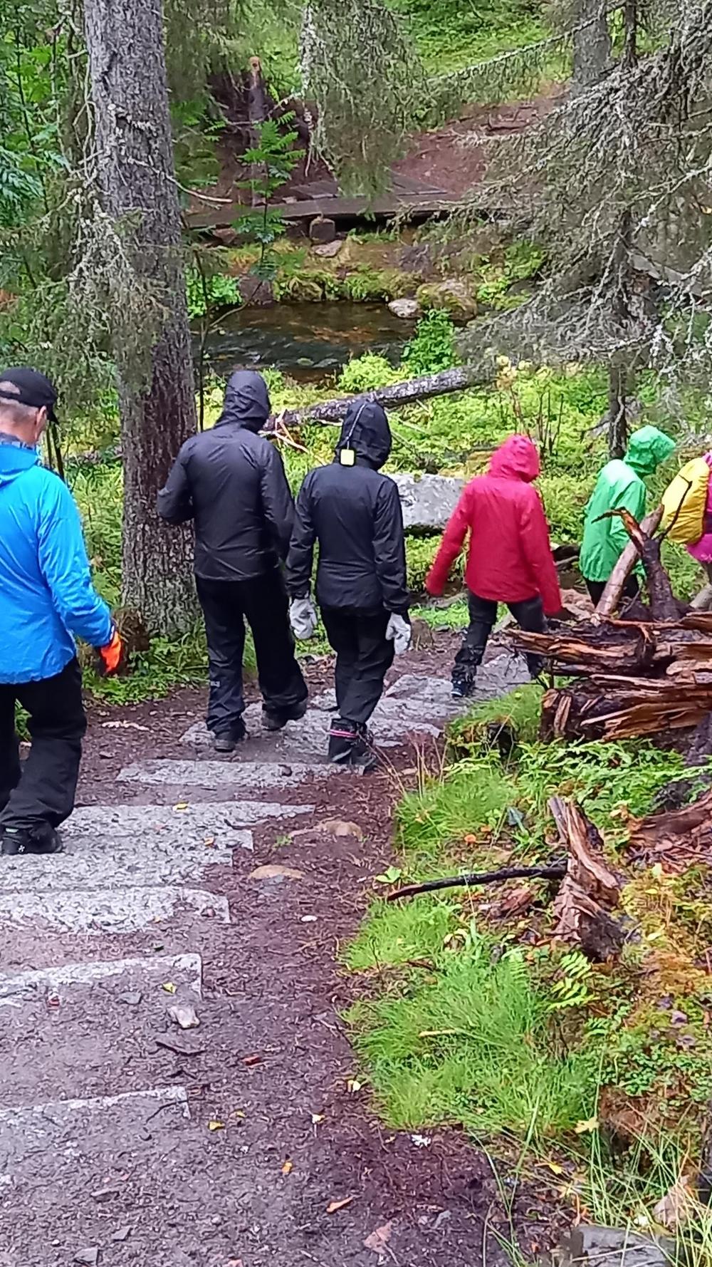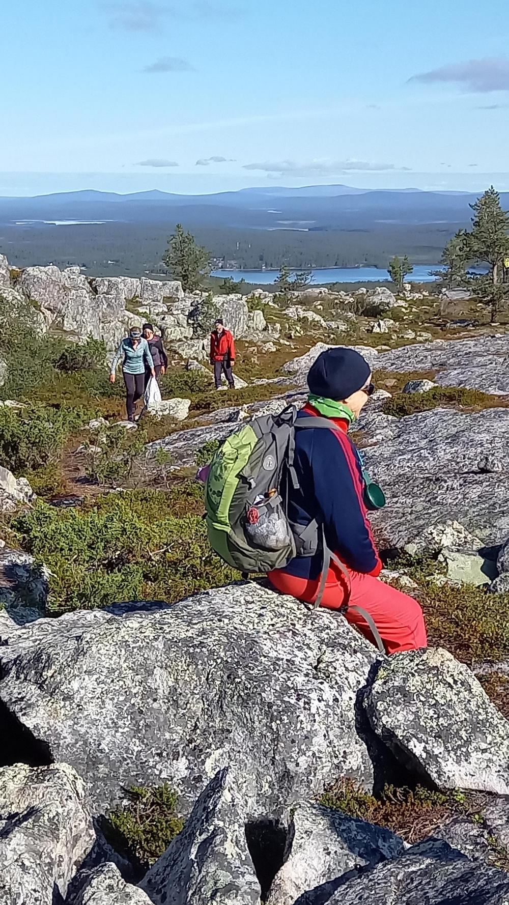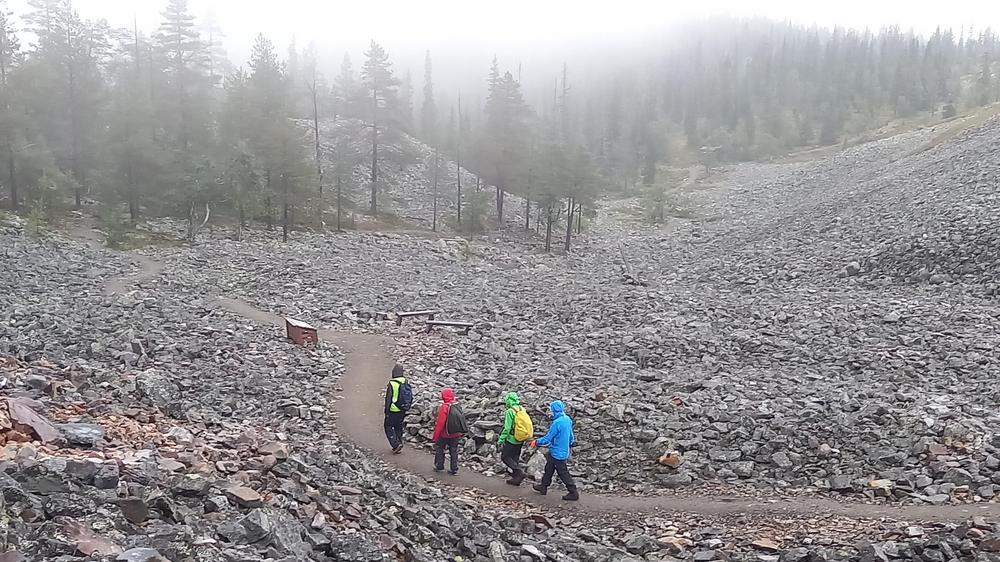 Ja niinhän siinä sitten kävi, että porukka jakaantui: kaksi innokkainta kilometrikisailijaa lähti pyöräilemään ja me muut pyöräilimme vain Äkäshotellille asti ja siirryimme siitä jalkamiehiksi. Sumuisessa kelissä kiersimme Kellostapulin ja Kesänkijärven. Rakkakivikon keskellä kiittelimme helppokulkuista reittiä.