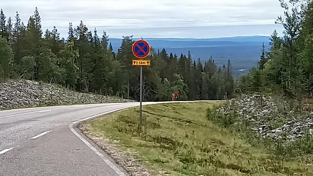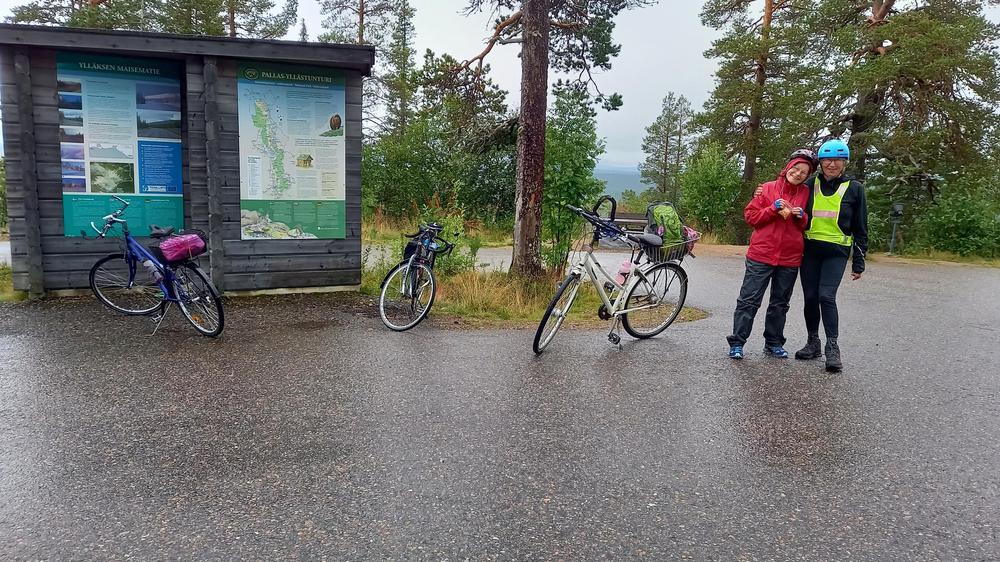 Kalustonamme ei ollut maastopyöriä, joten pysyttelimme enimmäkseen päällystetyillä teillä. Toisena päivänä tehtiin viikon pisin yhteinen pyörälenkki, 94 km, kun kiersimme Ylläksen seitsemän tunturin alueen Kuertunturia lukuun ottamatta, Äkäslompolosta Tiurajärvelle, sieltä Kittilän suuntaan ohi Aakenustunturin ja sitten Ylläsjärvelle. Maisematie ajettiin nyt toiseen suuntaan kuin edellisenä päivänä, nousu on tästä suunnasta jyrkempi eikä kevyen liikenteen väylää ole. Välillä huilaten, toinen toisiamme kirittäen ja kannustaen korkein kohta tavoitettiin.
