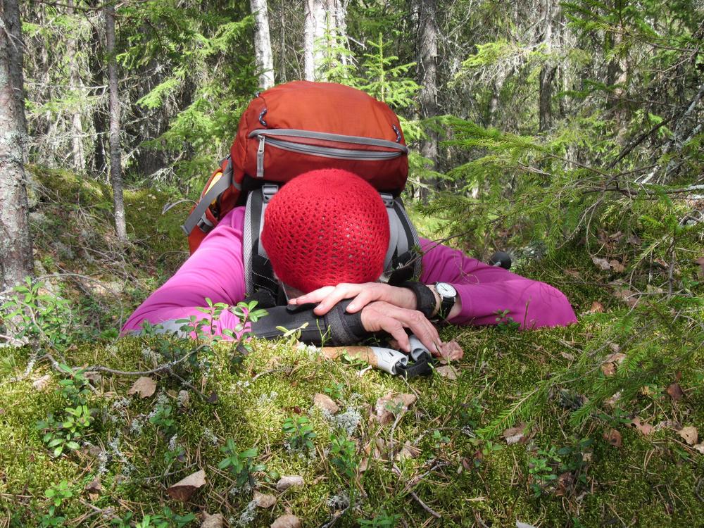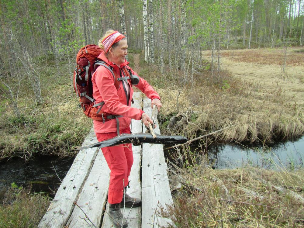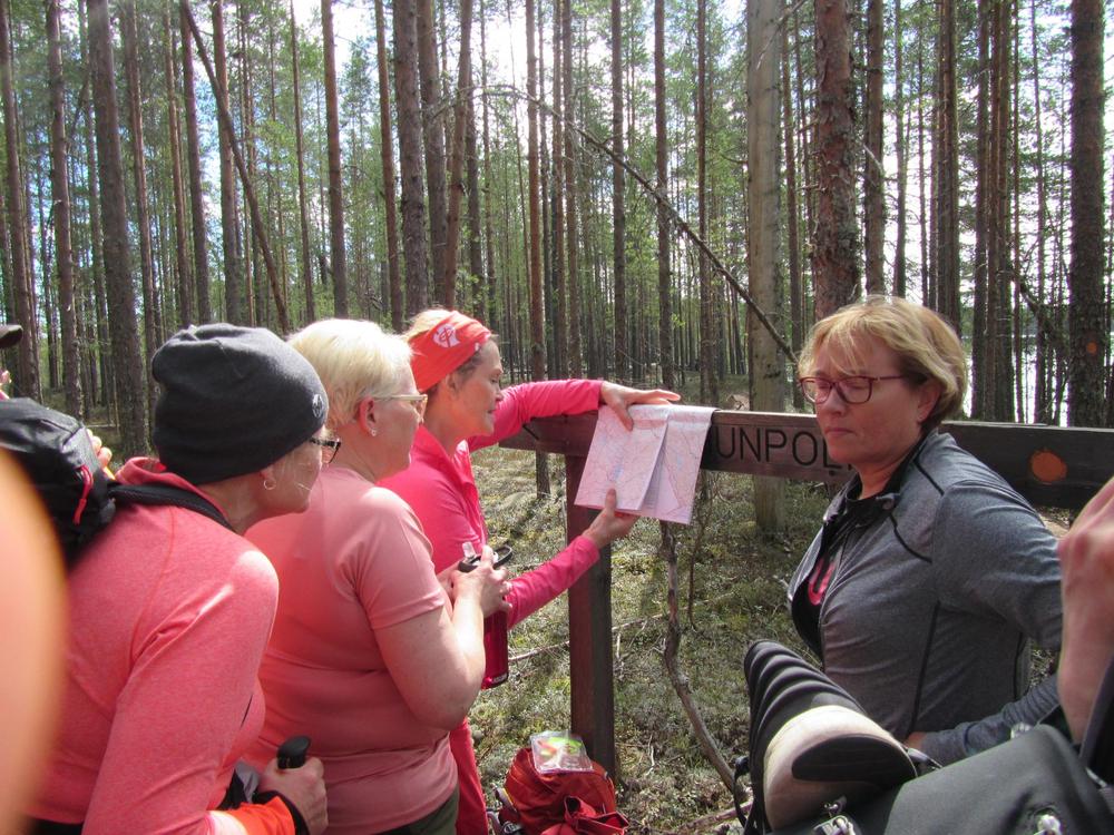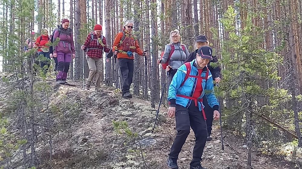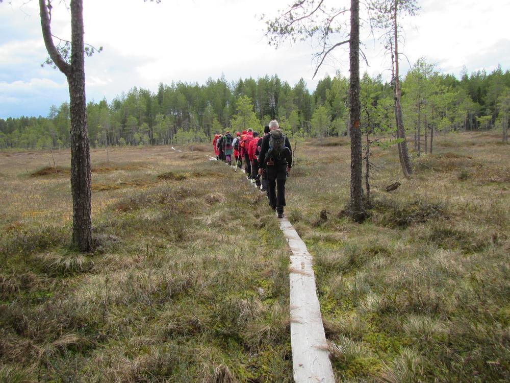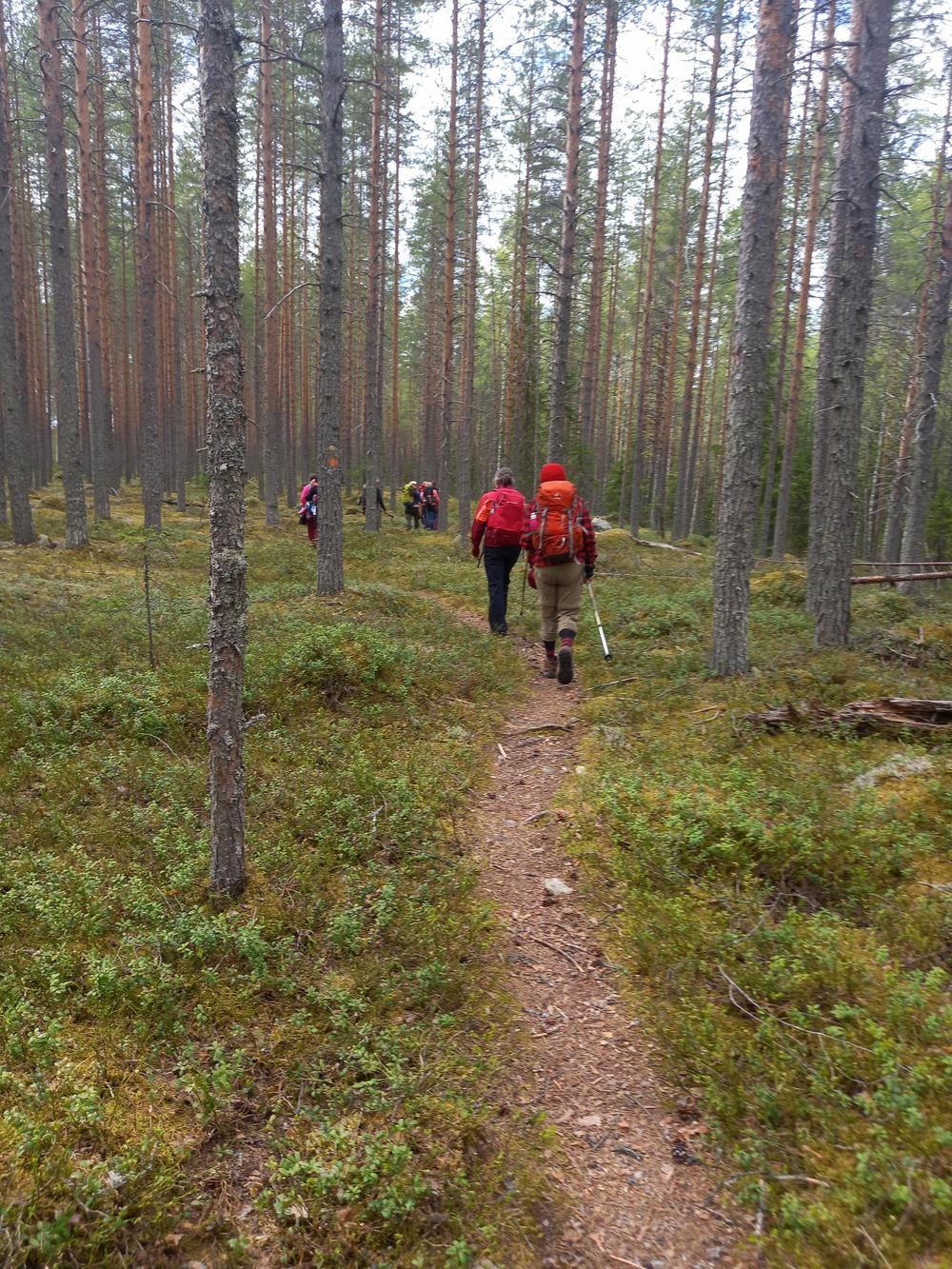 Helatorstaiaamuna matkaan lähti 14 kulkijaa, sekä konkarivaeltajia että vähemmän kokeneita. Vetäjinä ja oppaina toimivat Tuula Turunen ja Pilvi Tapio. Huoltoauton mukanaolo helpotti huomattavasti matkantekoa, kun suurin osa tavaroista kuljetettiin valmiiksi leiripaikalle ja selässä kannettiin vain päivän eväät ja varavaatteet. Sääennusteet lupailivat kosteaa viikonvaihdetta, mutta niin vaan pilvet väistelivät kulkijoita, että sadetta saatiin vasta viimeisellä yöpymispaikalla, kun teltat oli jo pystytetty.