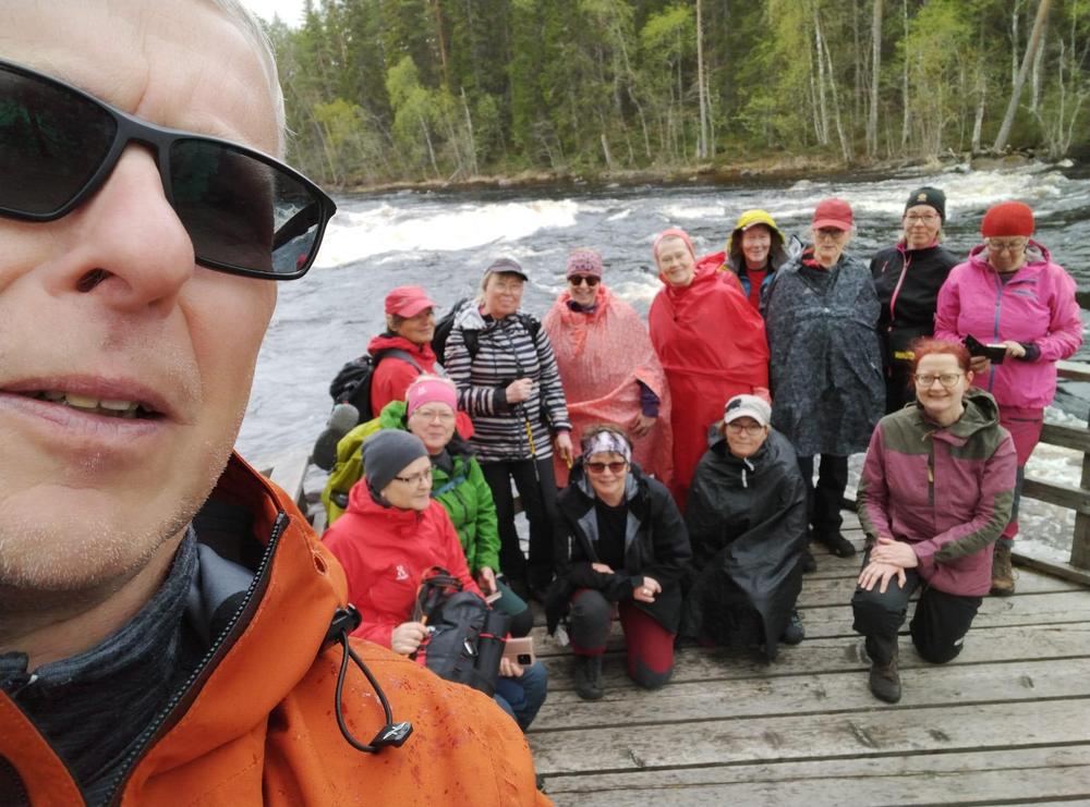 Reitillä nähtiin upeita harjumaisemia ja monenlaisia vesistöjä pienistä lammista ja puroista Ruunaanjärveen ja -koskiin. Sienten ystävät ihastelivat korvasienten paljoutta ja harmittelivat sitä, että ne piti jättää nyt keräämättä. Välillä pysähdyttiin tauolle kuuntelemaan Tuulan muistoja ja tarinointia alueen sotahistoriasta ja savottaperinteestä. Ja Karhunpolulla kun oltiin, niin tietysti nähtiin jälkiä myös karhuista. Lintujen kevätkonserteista sai nauttia melkein kellon ympäri; herkkäunisimmille olisi ehkä vähempikin riittänyt.